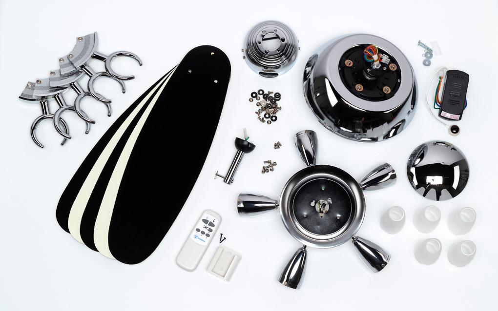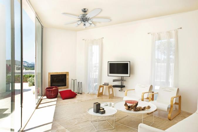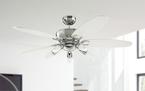 Contemporary and decorativeThe Westinghouse Arius ceiling fan thrives on its attractive materials and colors. The chrome housing surface, five integrated spotlight with opal frosted glass and the reversible blades in black and white characterize the modern appearance.