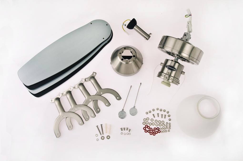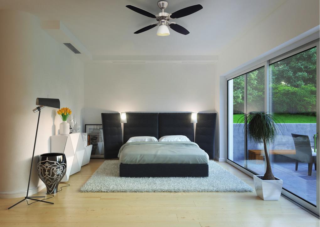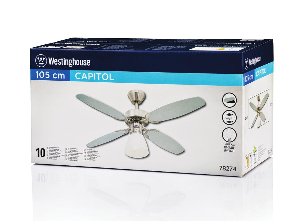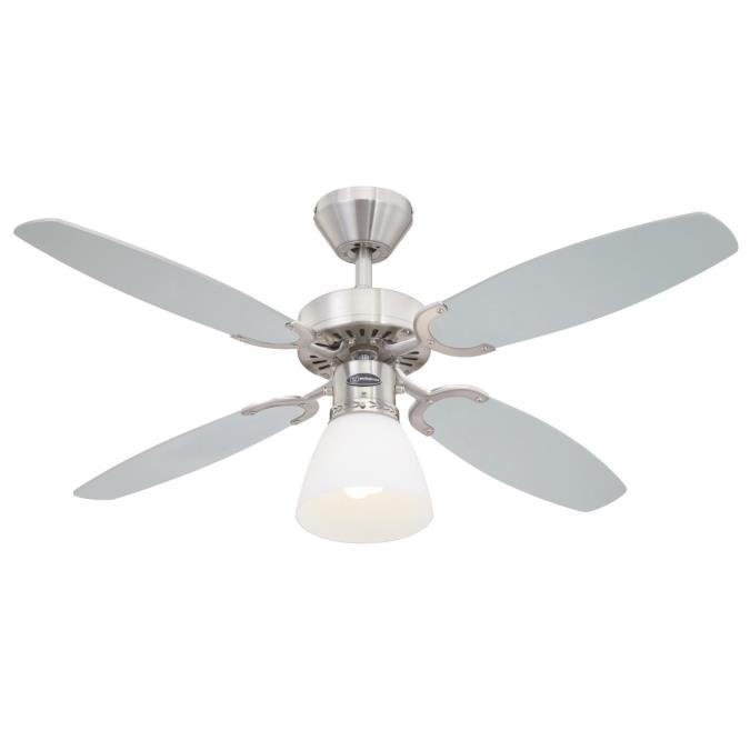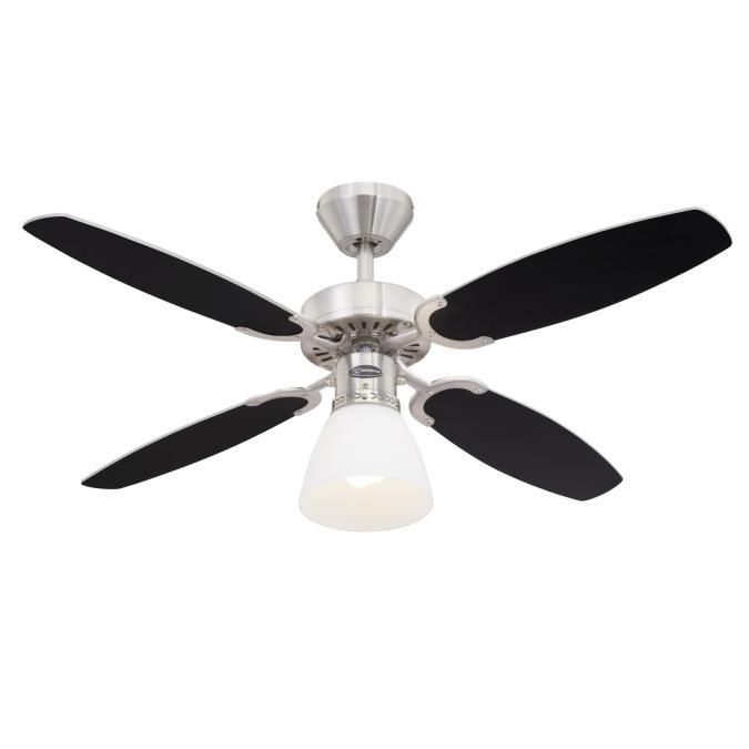 Classic modern and functionalThe dependable Westinghouse ceiling fan Capitol has a timeless and functional design. The housing surfaces in satin brushed steel with attractive applications, the open single lamp with opal frosted glass and the 4 reversible blades in silver and black give the Portland Ambiance Capitol an attractive appearance.