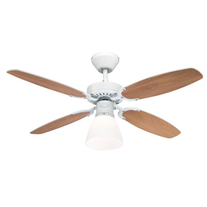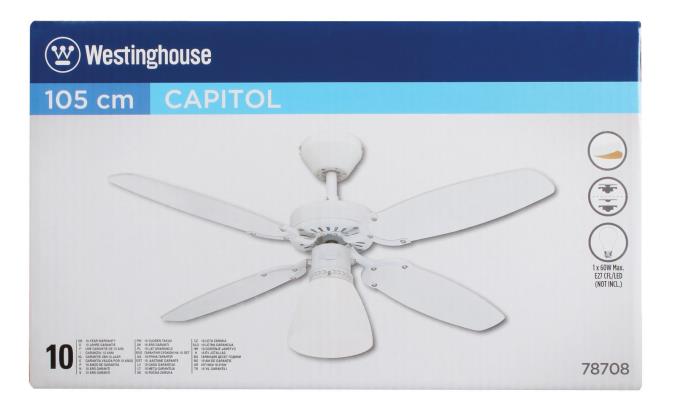 The energy-efficient Capitol indoor 105-cm ceiling fan features a crisp, white finish and opal frosted glass with a unique, angled shade. To complement the clean, modern design, the Capitol ceiling fan includes reversible blades in coordinating finishes. Customize the fan's look to suit your decor. White blades create a neutral look to blend into a room, while the beech blades create a soft contrast with textural interest.