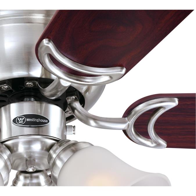 Add a distinctive traditional touch to any room with the 90-cm Contempra Trio indoor ceiling fan in brushed nickel finish. Complementary blade finishes create a sophisticated look. Coordinate with your decor using rosewood or beech finish. The fan's flush mount style provides year-round comfort in small rooms with low ceilings. A cluster of three frosted glass shades emits bright, beautiful illumination.