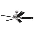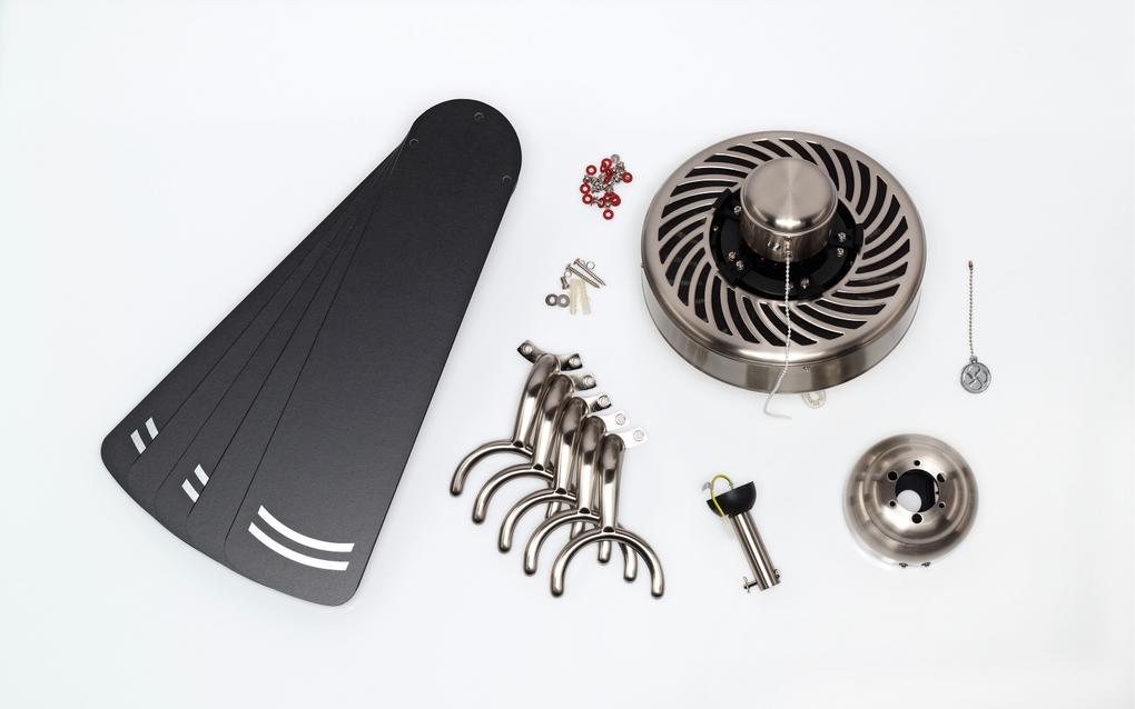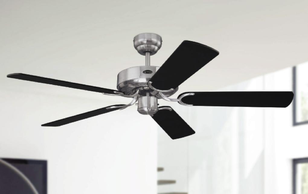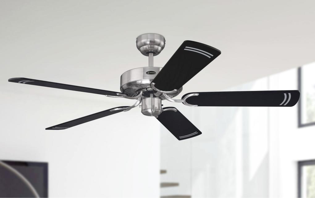Casablanca-styleThe Westinghouse Cyclone ceiling fan is our proven classic without lighting. The brushed steel housing surface and the blades in black and black with silver stripes have cult status.