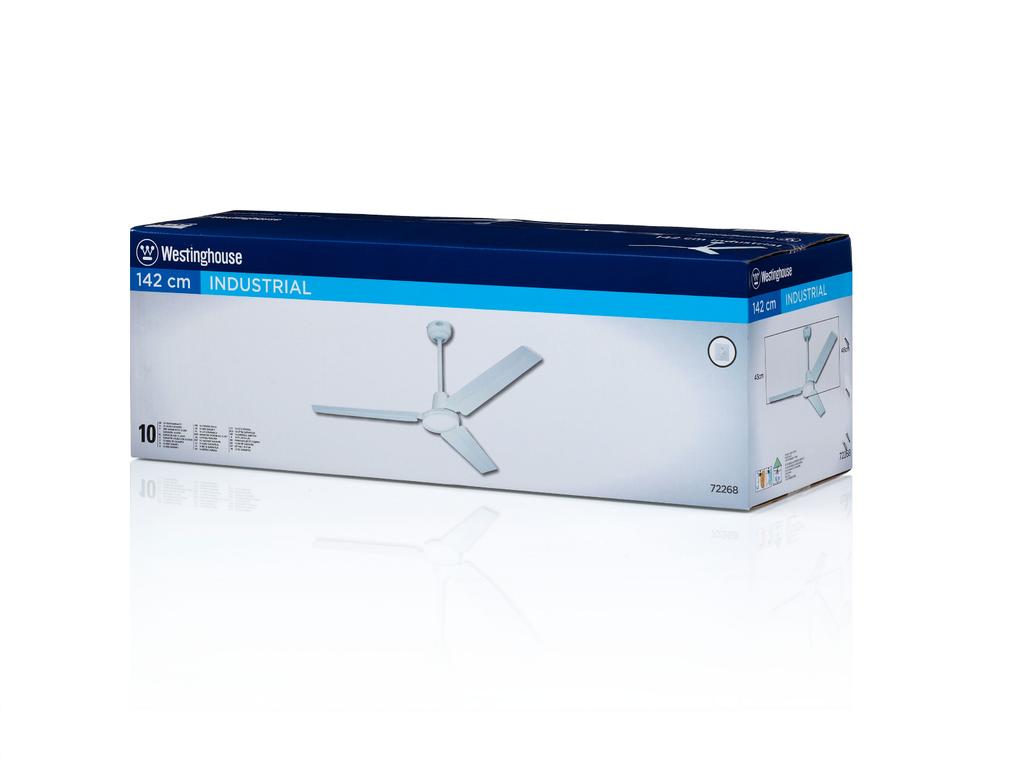 Bright, large and high-performanceThe Westinghouse Industrial Series ceiling fan is both a proven top seller as well as a design classic. This model is particularly suitable for large and/or rooms with high ceilings and receives high marks for its classic white housing surface and white steel blades.