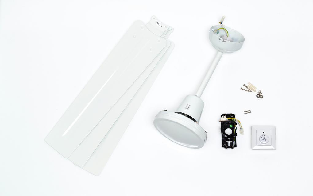 A white wall switch for easy speed control is included.