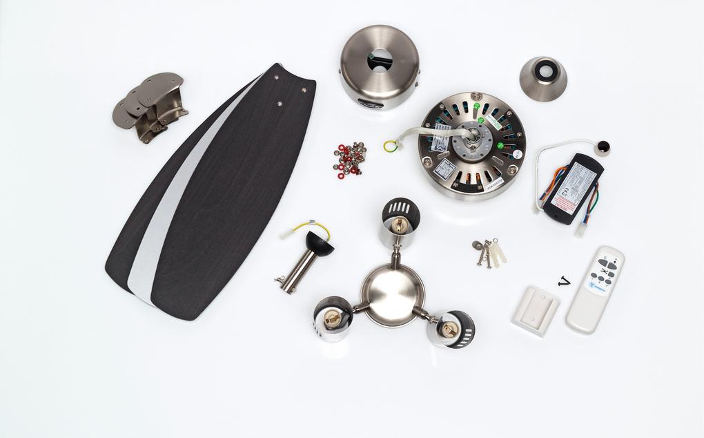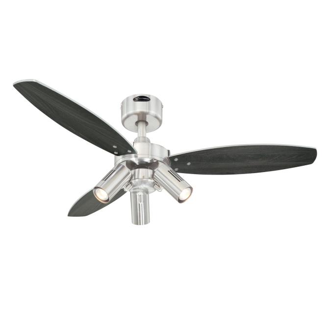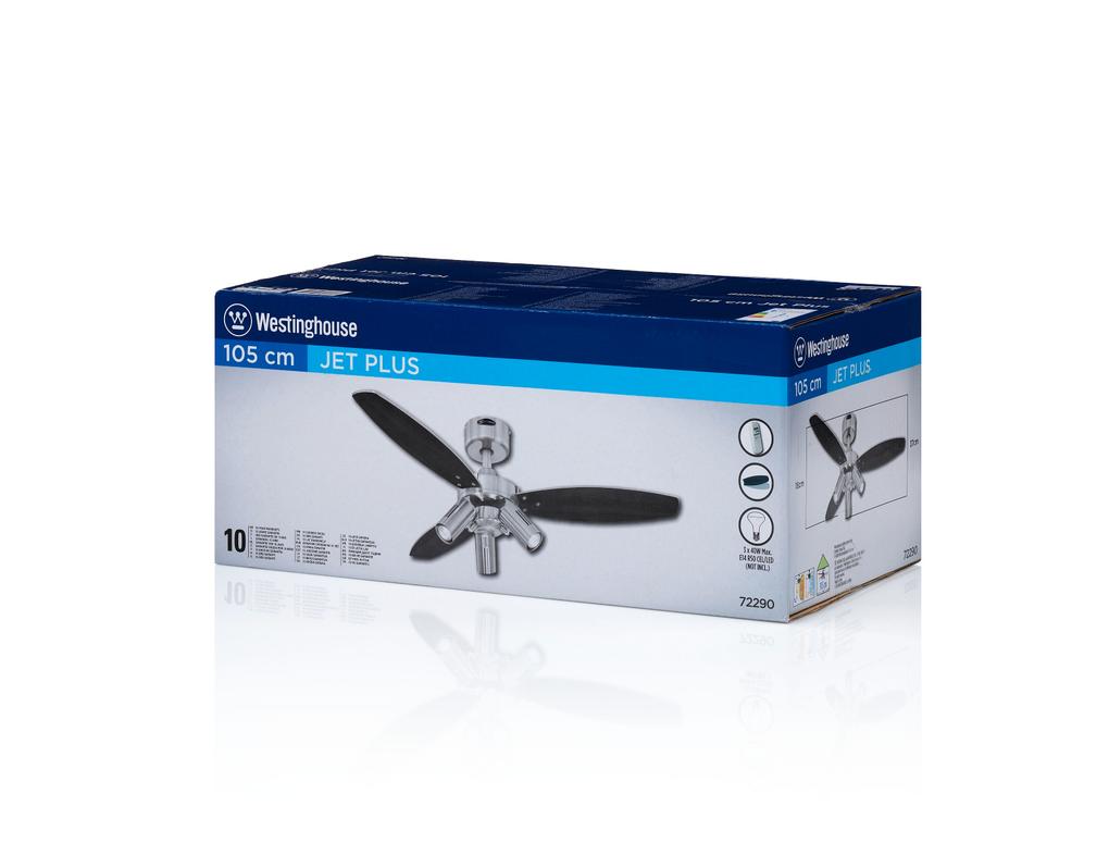 Plain and simpleThe Westinghouse Jet Plus ceiling fan is designed to be simple and functional. The housing surface in brushed nickel, the 3 lamps each with max. 40 watts (bulbs not included) and the 3 attached reversible blades in wengue and silver give the Jet Plus its harmonious appearance and allow it to blend easily into any interior style.