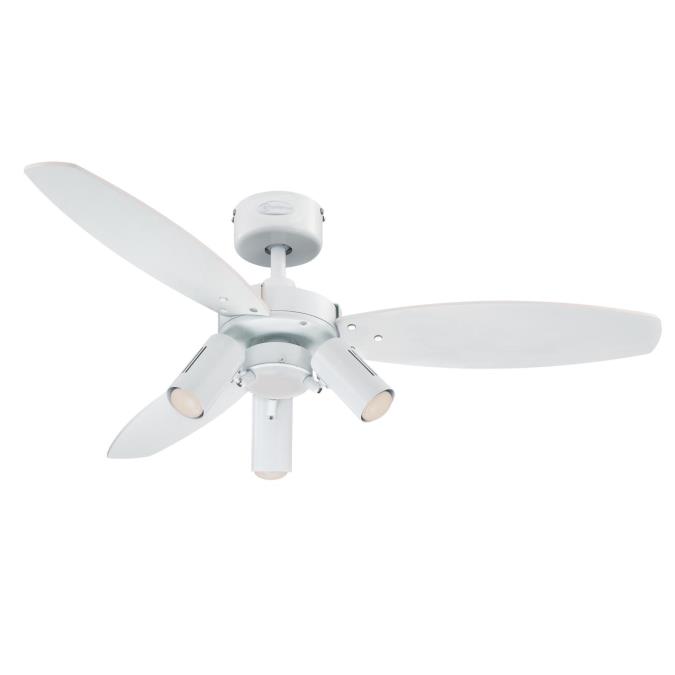Add a contemporary touch to your home with the energy-efficient 105-cm Jet Plus ceiling fan. The white finish, sleek silhouette and spot light kit have a fresh, modern look that enhances any space. Reversible blades are included with two coordinating finishes to easily match your decorative style. Choose white finish for a clean monochromatic look that blends seamlessly into a room, or choose light maple finish to add a textural contrast and a warm touch.