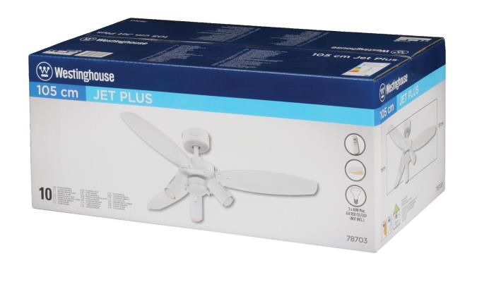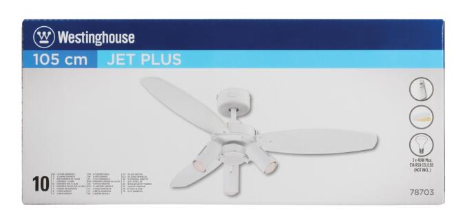 A high-quality, energy-efficient motor and a reverse switch on the fan allows you to use the Jet Plus year-round so you can enjoy the energy-savings a ceiling fan provides. This fan is LED compatible. We recommend using three Westinghouse LED light bulbs #37127 (not included). The Jet Plus ceiling fan also includes a remote control for added convenience.