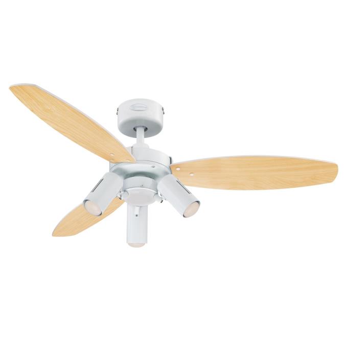 - Indoor ceiling fan offers contemporary style with a white finish and reversible white/light maple blades