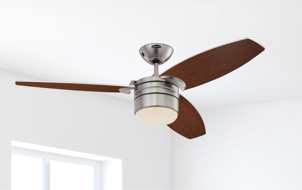 Modern interpretation of a traditional designNew in the Classic program: Westinghouse Lavada, a ceiling fan, which was designed to be both stylish as well as lavish. The housing surface of matt chrome, a single light with opal frosted glass and 3 reversible blades with golden and weathered maple emphasize the unmistakable character.
