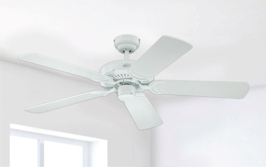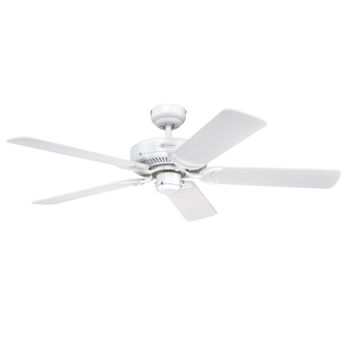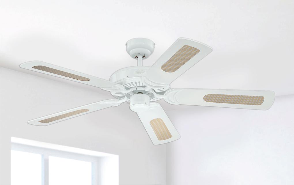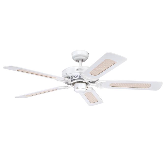 Contemporary aesthetic in whiteThe Westinghouse Monarch belongs to the category with both modern as well as traditional-style ceiling fans. The housing surfaces in white and the 5 reversible blades in white and white with rattan cane characterize the discreet appearance of the monarch.