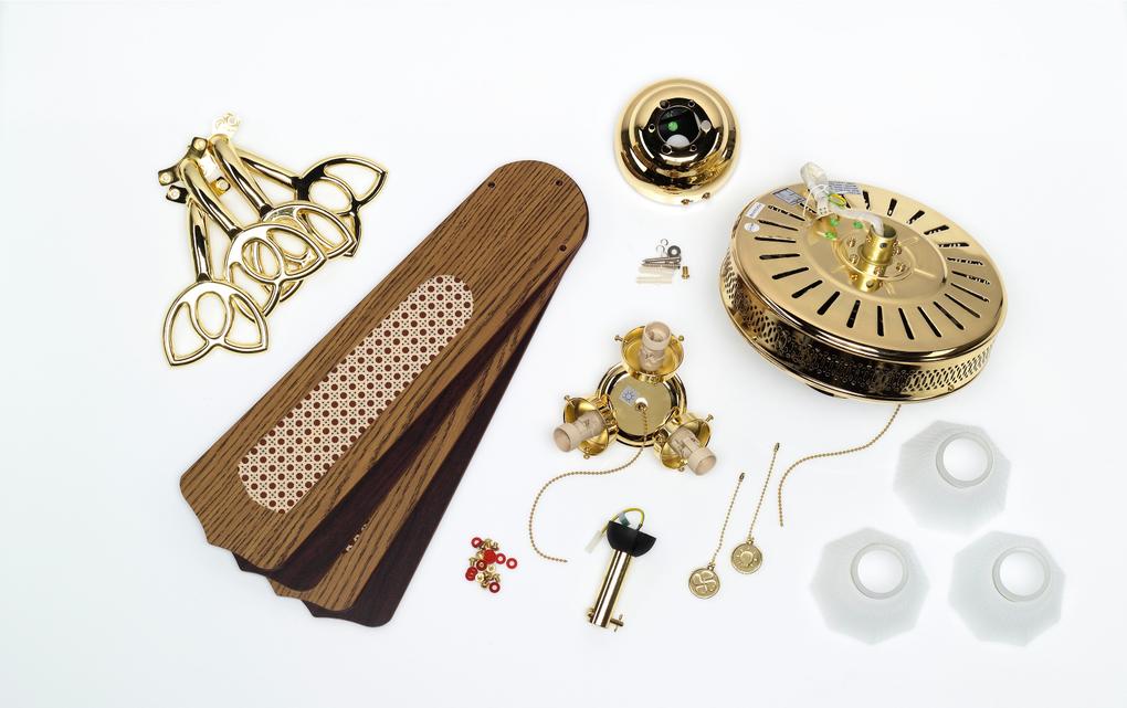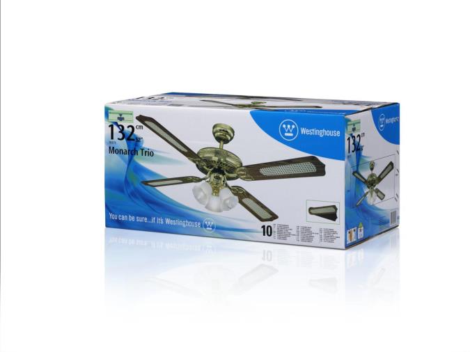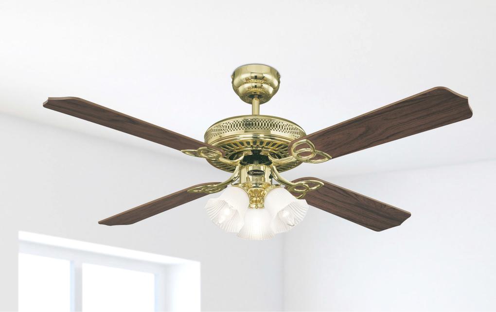 The originalThe design of the Westinghouse Monarch Trio ceiling fan is pure tradition. The design in polished brass, the decorative 3 light fixture and 4 reversible blades in oak with rattan and mahogany give the Monarch Trio its high quality historic design.