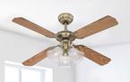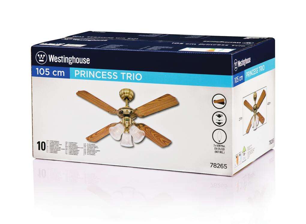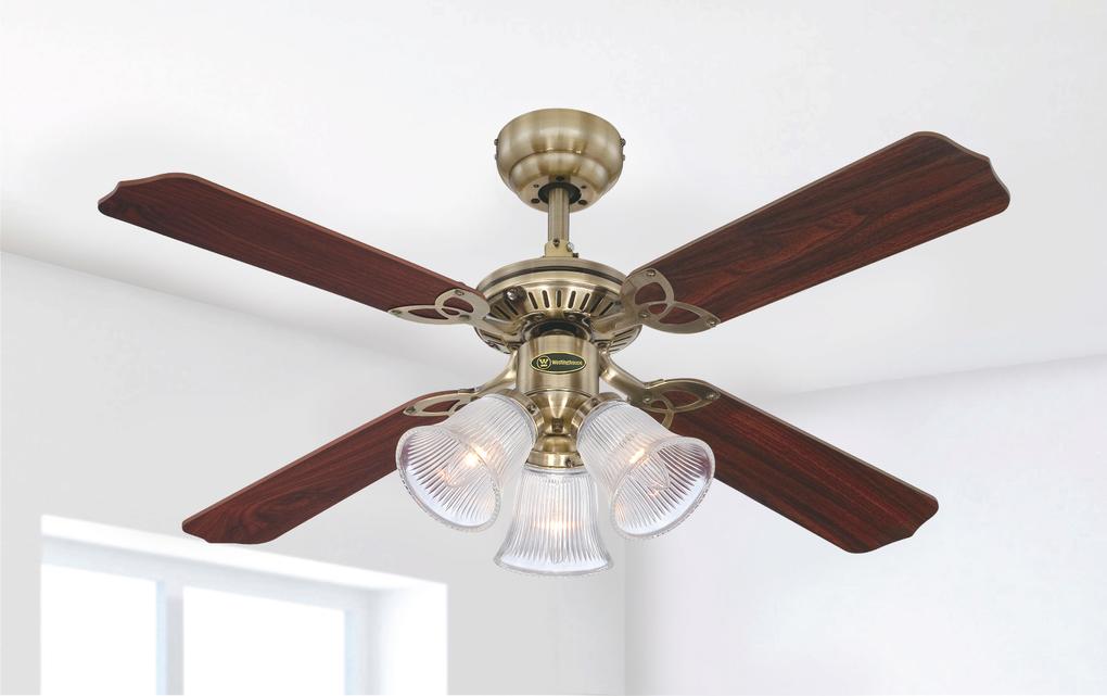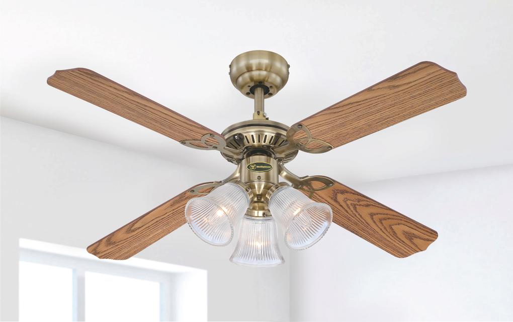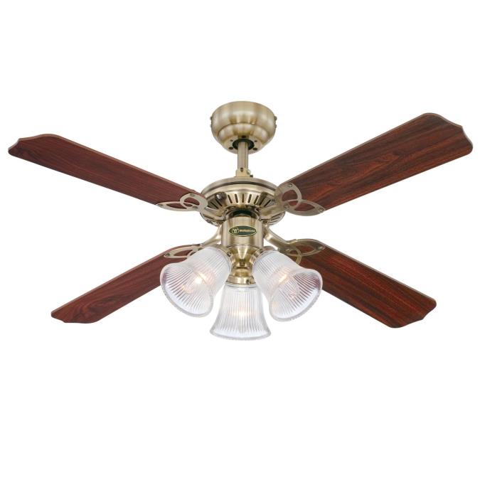 Timeless elegantThe Westinghouse Princess Trio belongs to the family of traditional-style ceiling fans. Housing surfaces in antique brass, 3 lights with ribbed clear glass and the 4 reversible blades in oak and mahogany with a natural appearance characterize the antique look of this model.