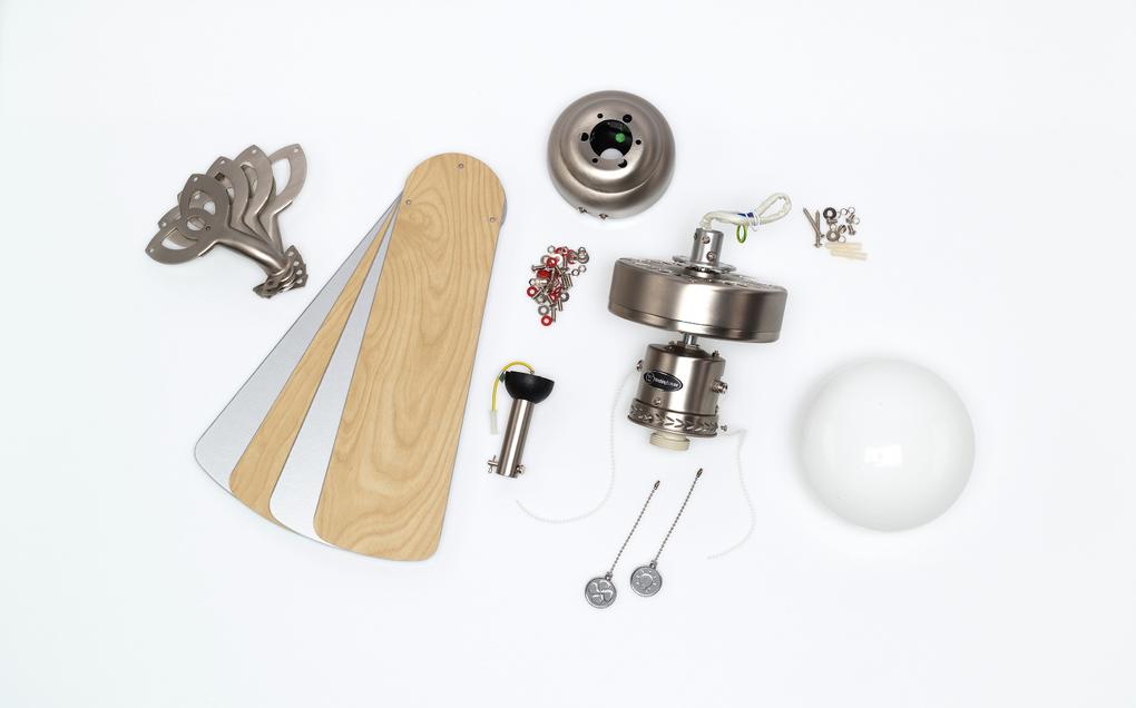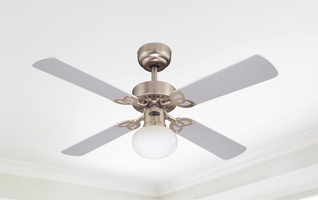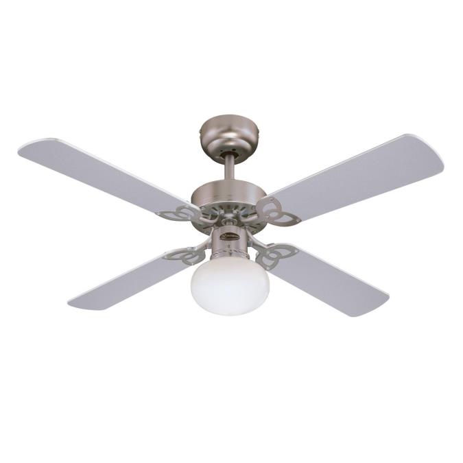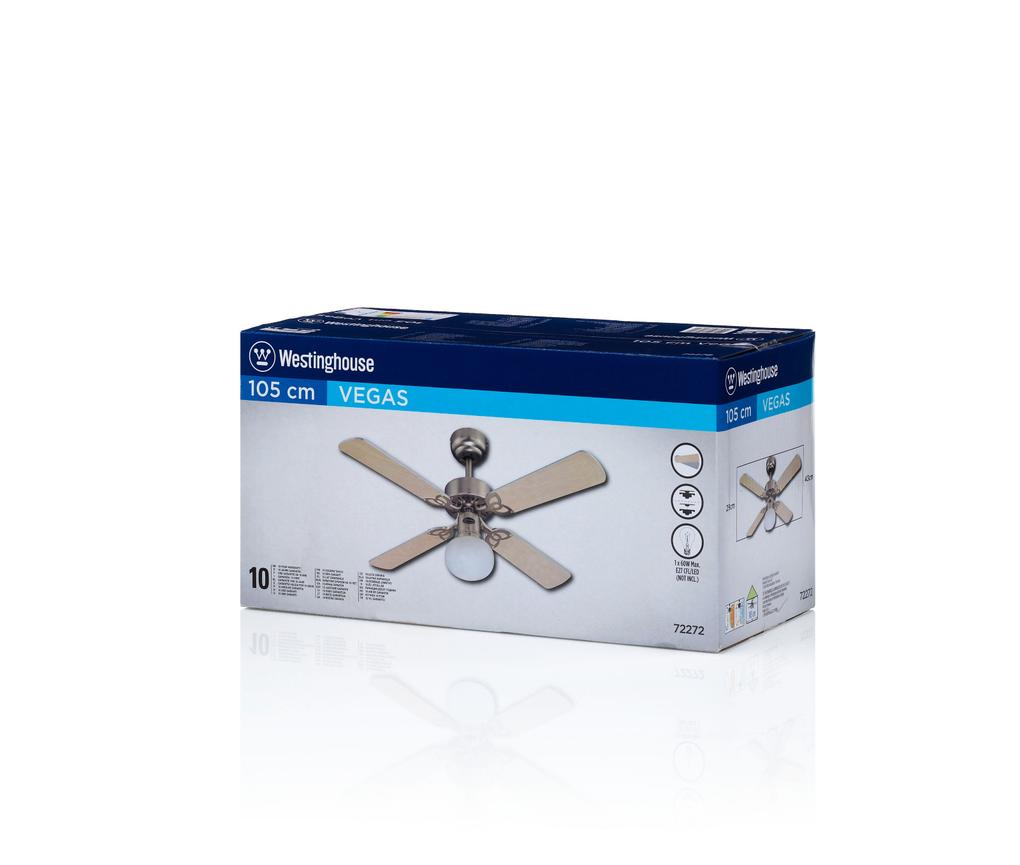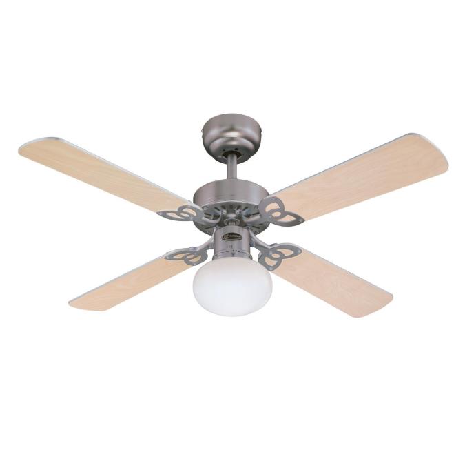 Refined classicThe Westinghouse Vegas ceiling fan is one of the most popular basic models. The design was refined: the housing surface in brushed aluminum, a single light with frosted glass and the 4 reversible blades in maple and silver turn the Vegas into a high-quality accessory for any room.