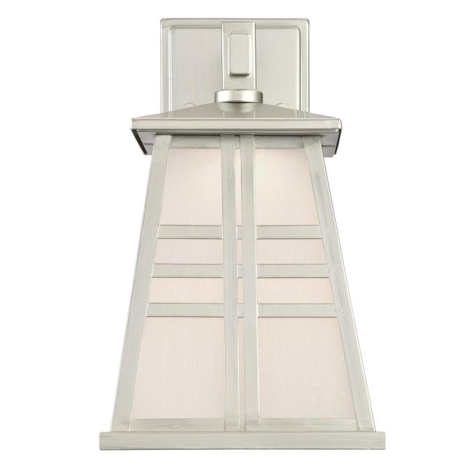 Extend a luminous welcome with this outdoor LED wall lantern's energy-saving ambiance and distinctive look. This versatile design highlights a variety of styles, from rustic, to country to coastal outdoor spaces. Brushed nickel finish adds a modern touch to the charming windowpane design. Light is beautifully diffused through frosted seeded glass panels that light your way while saving you money.