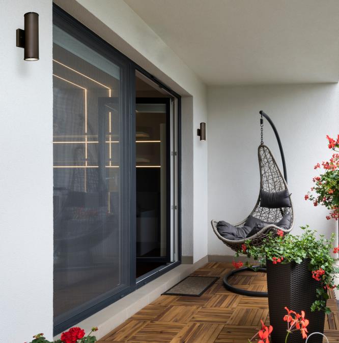 - Outdoor wall fixture adds a refined accent to modern exteriors