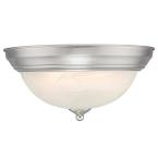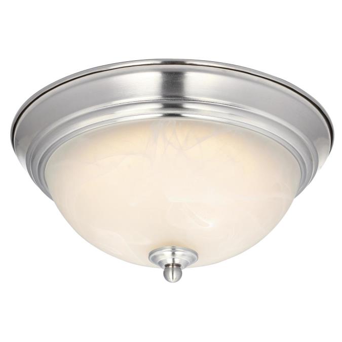 This flush mount ceiling fixture combines traditional design with energy-efficient LED technology. Its sleek brushed nickel finish and white alabaster glass shade complement a variety of interior decors, and coordinate with any color scheme.