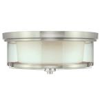 Add a decorative touch to a kitchen, hallway, bedroom or bathroom with this attractive flush mount ceiling fixture. With a contemporary brushed nickel finish and dual glass cylinders, the "wagon-wheel" design will add personality and beautiful bright light to any space.