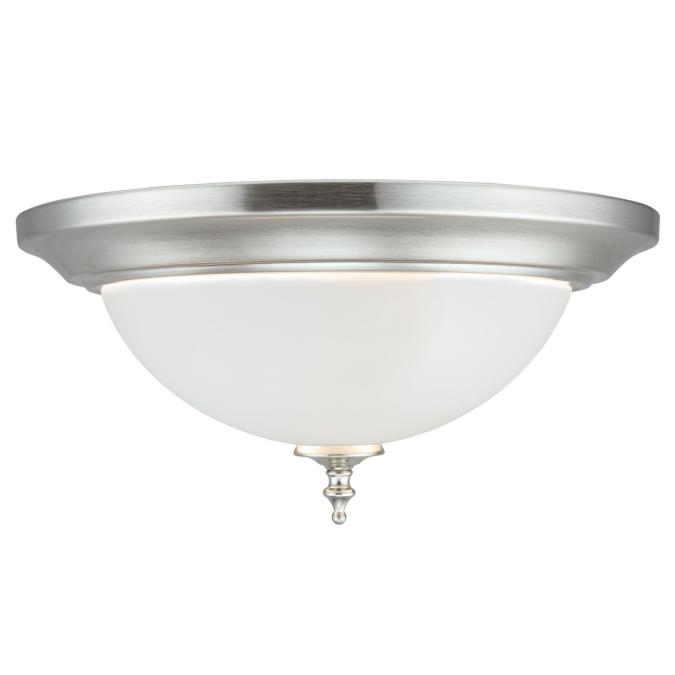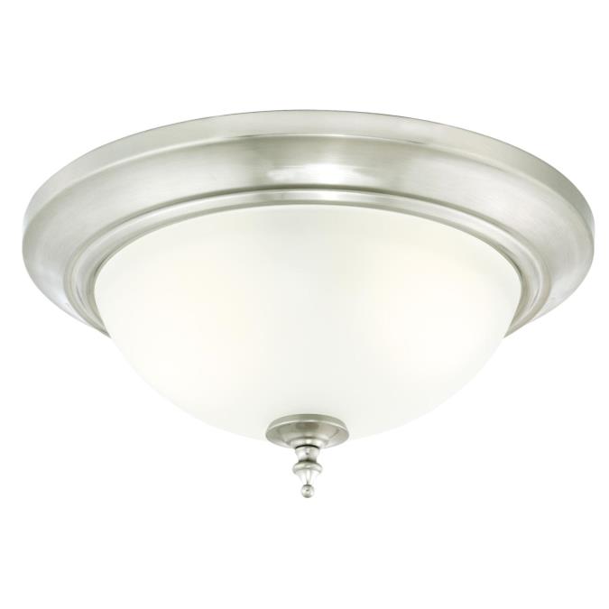 With its classic style, brushed nickel finish and frosted glass, this ceiling fixture will add casual elegance to any room.