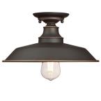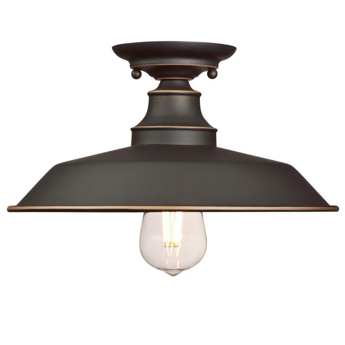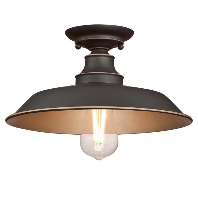 The industrial-vintage design of the Iron Hill semi-flush mount fixture is perfect for many living spaces, from modern to farmhouse style homes. A rustic, oil rubbed bronze finish with highlights on the metal shade is enhanced by a metallic bronze finish on the inside.