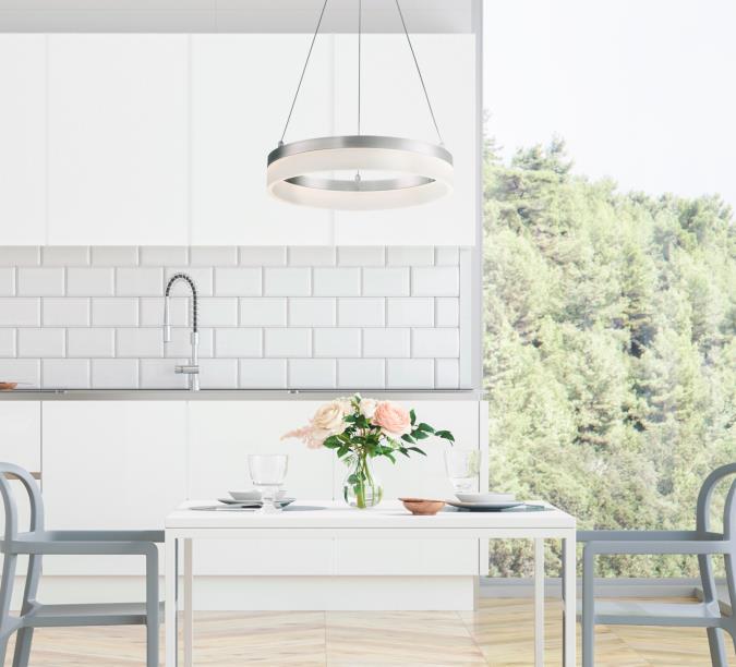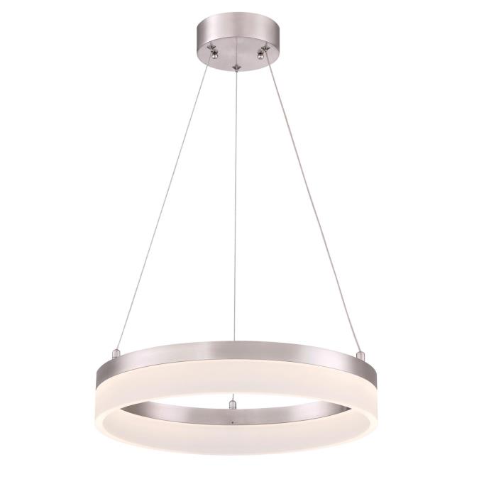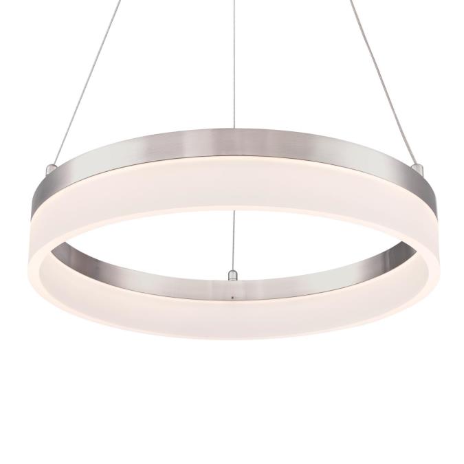 Incorporate the contemporary styling of the Lucy 1 light LED pendant into any space for a refreshing update to conventional pendant lighting. The smooth transition from brushed nickel to illuminated frosted acrylic ring creates a polished, modern pendant design.