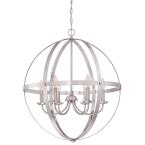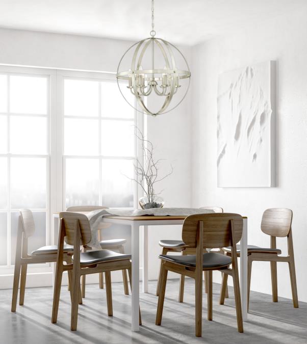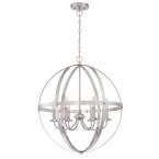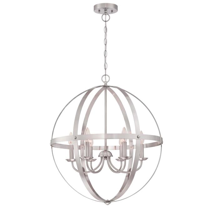 Brushed nickel finish adds a modern touch to this spherical Stella Mira chandelier. Its grand size draws attention to the classic six-light candelabra glowing inside. The beautiful metal orb design creates a feeling of openness, ideal for dining rooms, entryways and open-concept living spaces.