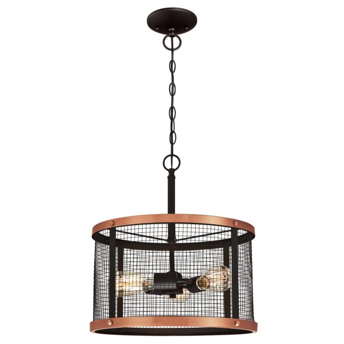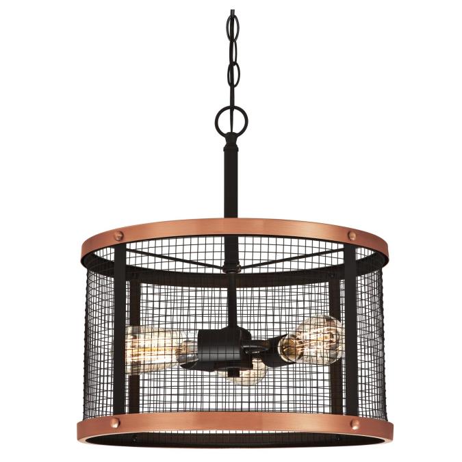 The three-light pendant features a mesh shade and a view of the bare bulbs, capturing a retro utilitarian aesthetic. An oil rubbed bronze finish is highlighted by washed copper trim, enhancing the vintage industrial appeal.