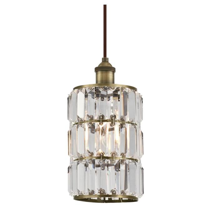 - Crystal prism, cylinder-shaped glass with antique brass trim, adds a classic touch to this pendant design