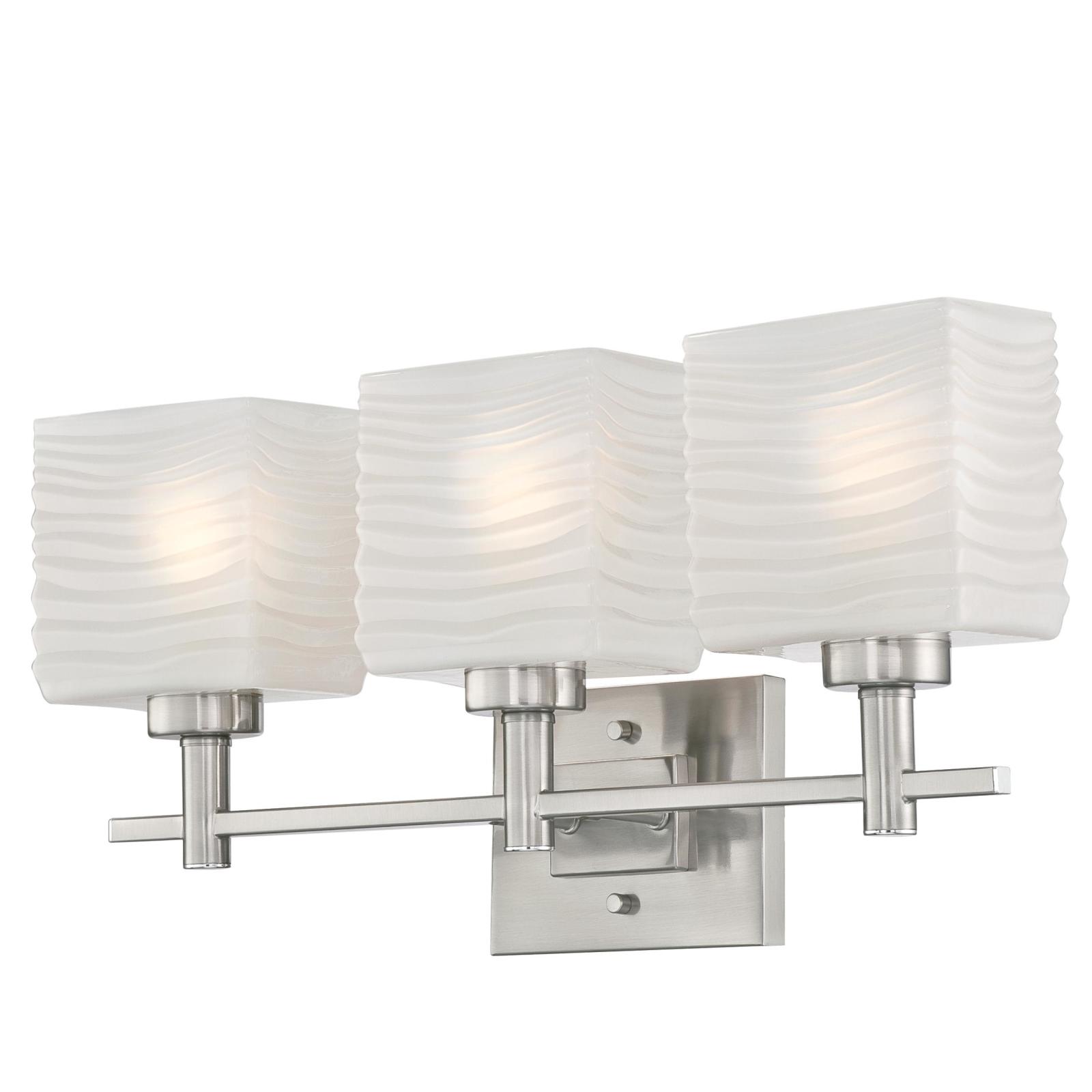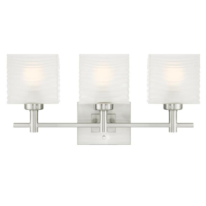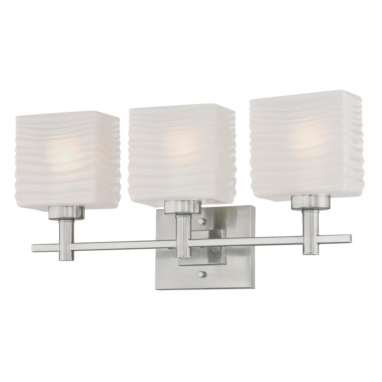 Add personality and light to any home with the distinctive patterned glass and clean lines of the Alexander three-light indoor wall light. A stunning accent in a bathroom, as a vanity light, this fixture is designed with an elegant brushed nickel finish and rippled white glazed glass. Perfect for residential and commercial interiors from modern traditional to contemporary.