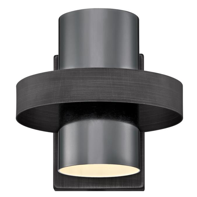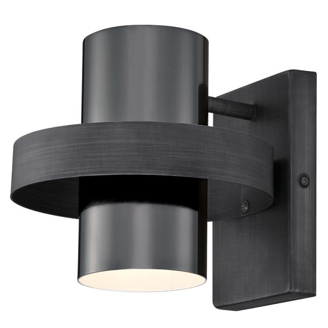 The Evita one-light wall fixture is visually enticing in any room. The shiny cylinder shade in gun metal finish subtly contrasts with the distressed aluminum ring and backplate in this contemporary, geometric design.