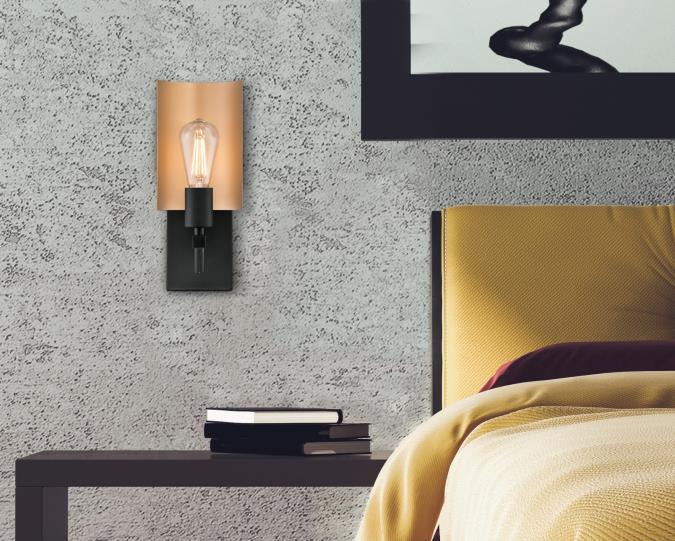 The outward-facing shade of the Sirino matte black wall light reflects a warm radiance. With a metallic bronze finish on the inside, this wall light brightens living rooms, hallways, dining rooms and bathrooms beautifully.