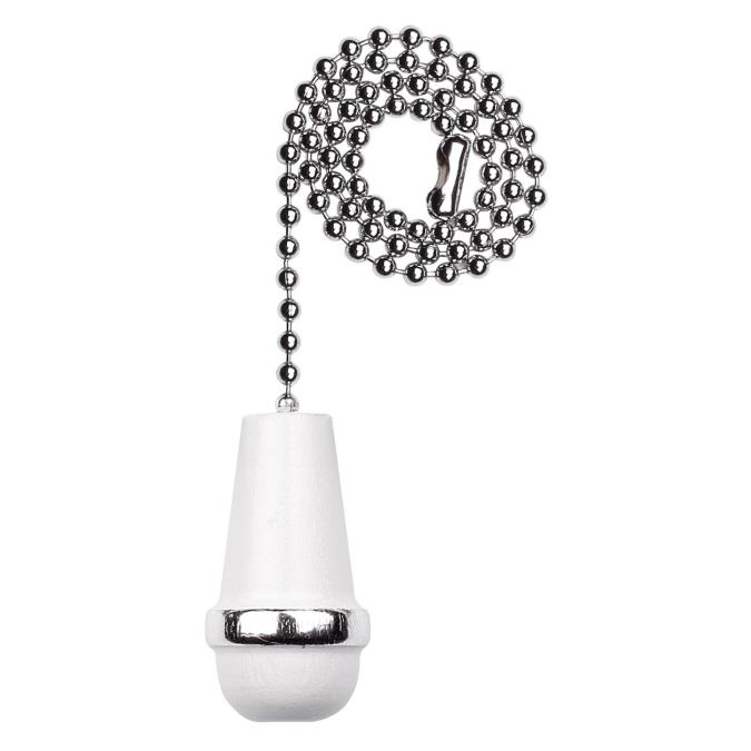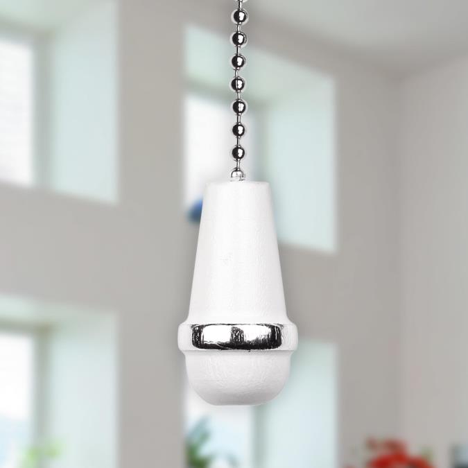 With its simple design and wooden finish, this pull chain goes well with most decors. The white wooden cone handle, with chrome band accent is easy to grasp. An ideal replacement for broken pull chains and a perfect decorative accent for any existing ceiling fan.