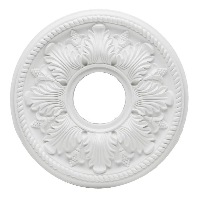 This 35,6 cm diameter ceiling medallion provides an added decorative element to complement existing molding, woodwork, or other architectural details. Use it to cover a hole or hide ceiling blemishes and cracks that may appear around ceiling fans and lighting fixtures. The medallion is made of durable, lightweight polyurethane that will never warp, split, or splinter. Simply apply adhesive and use the included screws to fasten the medallion to any surface.
